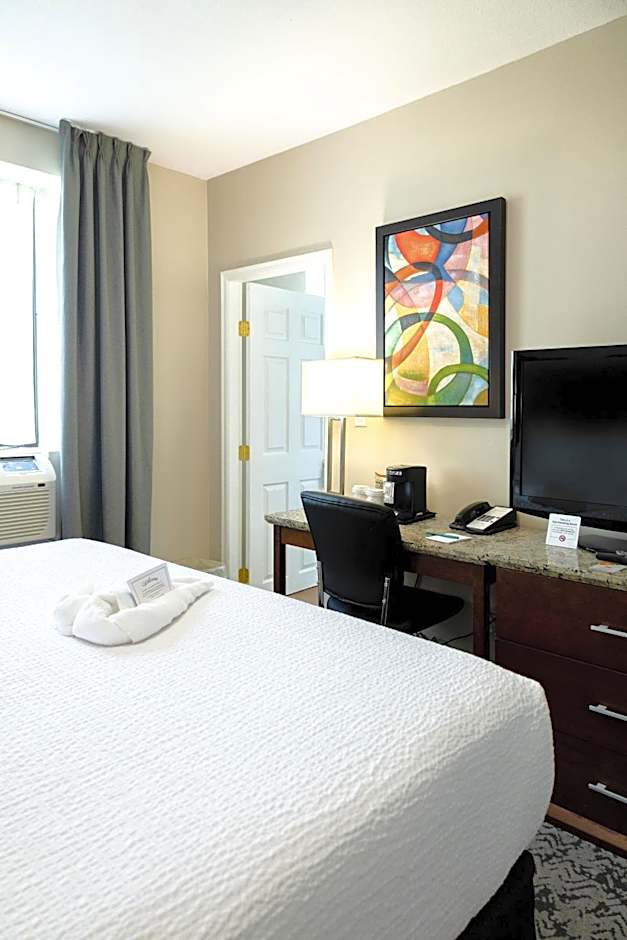 This suite includes a separate bedroom with a 37” LCD TV. The sitting area offers a double sofa bed and a 32” LCD TV. A kitchenette includes small refrigerator, microwave, sink and two-burner stove top. A small table and chairs are provided. Free WiFi is provided.